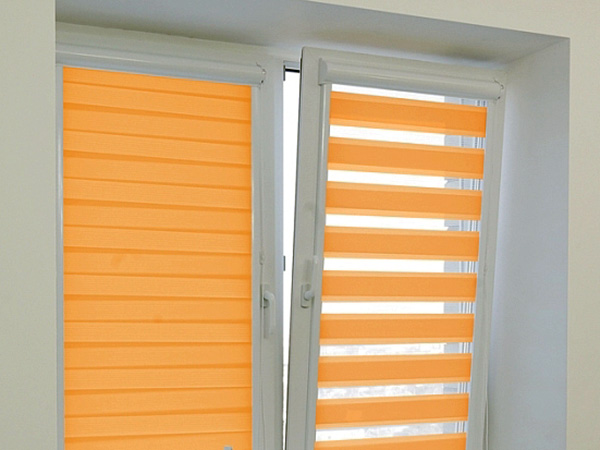 Шторы день-ночь или зебра - это разновидность рулонных штор с двойным слоем ткани. Ткань имеет горизонтальные полоски, одна из которых полупрозрачная, а другая плотная. Управление шторами может осуществляться как вручную, так и с помощью электропривода. Шторы типа зебра можно устанавливать на окно с помощью двухстороннего скотча, либо накидного кронштейна, что позволяет сохранить раму окна целой.
